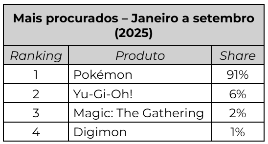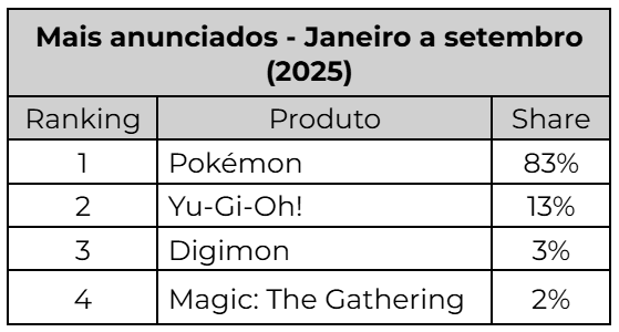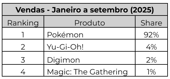Dentre as quatro marcas analisadas, o Pokémon é campeão no ranking de vendas, com 92% de participação. O Yu-gi-oh ocupa o segundo lugar, com 4%, seguido pelo Digimon, com 2%, e pelo Magic: The Gathering, com 1% .